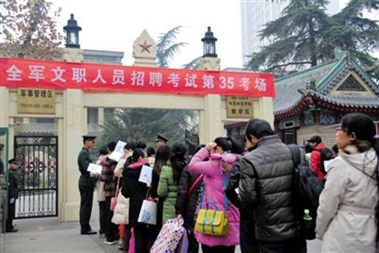 12月15日,在解放軍南京政治學(xué)院考點(diǎn),考生等候進(jìn)場(chǎng)參加考試。當(dāng)日,軍隊(duì)首次統(tǒng)一招聘文職人員考試舉行,據(jù)解放軍總政治部有關(guān)部門介紹,共有10萬余人報(bào)名應(yīng)聘,報(bào)名和錄取比例平均為38∶1。